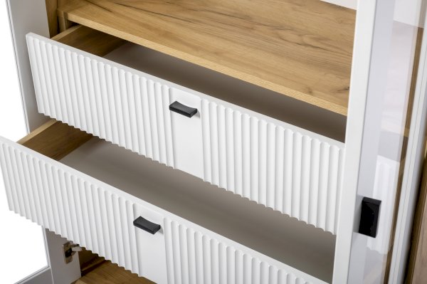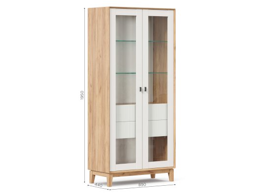• За сборными распашными дверями со стеклом две стационарные горизонтальные перегородки и две съемные стеклополки.