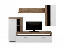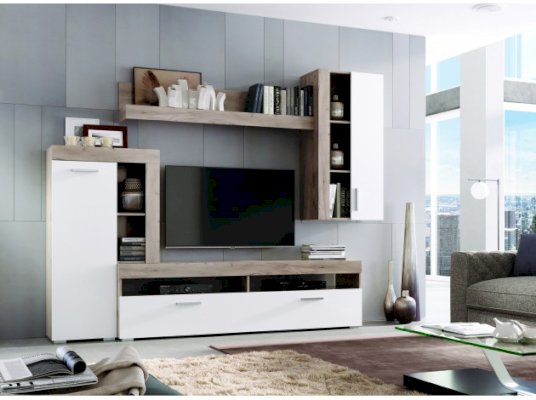 Преимущества: вместительная — множество открытых и закрытых полок для мультимедиа аппаратуры, книг, сувениров и предметов декора; стильная — минималистичный дизайн гармонирует с оригинальным цветовым исполнением; функциональное наполнение — включает ТВ-тумбу, большую навесную полку и два небольших, но функциональных шкафа.
