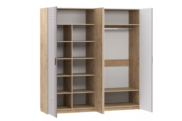 Четырехстворчатый шкаф LIVORNO НМ 013.58 станет достойной альтернативой гардеробной комнате, сэкономит пространство и задаст стиль интерьеру спальни. Внутри модуль разделен на две равные секции. В левой части шкафа находится секция из восьми полок для хранения одежды в сложенном виде. В правой половине модуля установлена штанга для одежды на вешалках плечиках. Зеркальные фасады добавят свет и визуально расширят комнату.