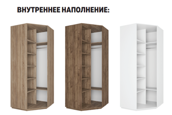 • Солидное наполнение: с левой стороны углового шкафа располагается 5 полок, с правой — две полки и штанга для одежды