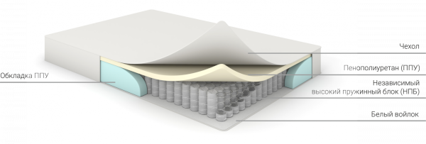 • высокий матрас с ортопедическим эффектом на основе блока независимых пружин и слоя ППУ. Подстраивается под анатомию человека. Одинаково комфортен для людей с разными весовыми категориями