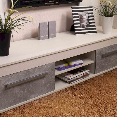 Мебель под ТВ в спокойной сероватой гамме идеально впишется в современный городской интерьер. Фасады ящиков "под бетон" хорошо обыгрывают серебристые ручки из массива дерева. Ящики комплектуются шариковыми направляющими полного выдвижения, что обеспечивает им легкую простую установку и максимальное использование полезной площади ящика. Глубина ящика 40 см, высота 17 см, ширина 51 см. Регулируемые опоры позволяют компенсировать незначительные неровности пола.